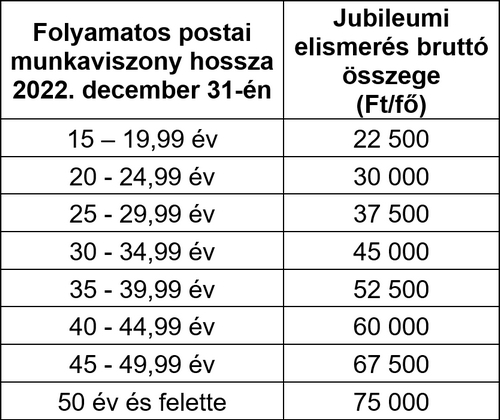 A jubileumi elismerés összegének meghatározása az elért folyamatos postai munkaviszony alapján a következők szerint történik, amely a Postai Világnaphoz kötődően - a szeptemberi bérrel - október 5-én kerül kifizetésre.